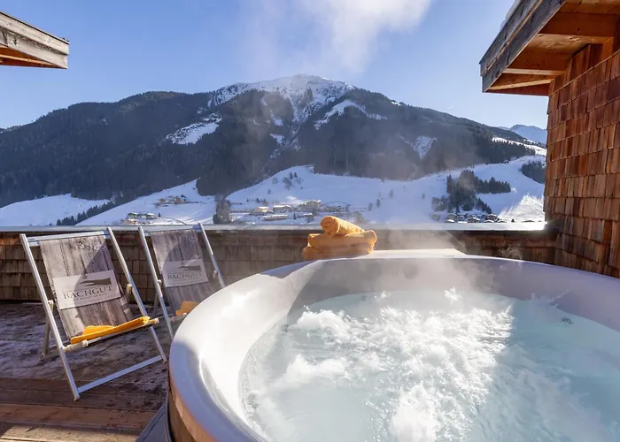 Bachgut, Das Resort Am Berg - Chalet 3 Saalbach-Hinterglemm leży w dzielnicy Hinterglemm oraz oferuje pokoje z widokiem na górę, który roztacza się z tarasu. Dom wakacyjny oferuje gościom relaksujące doświadczenie z jacuzzi.